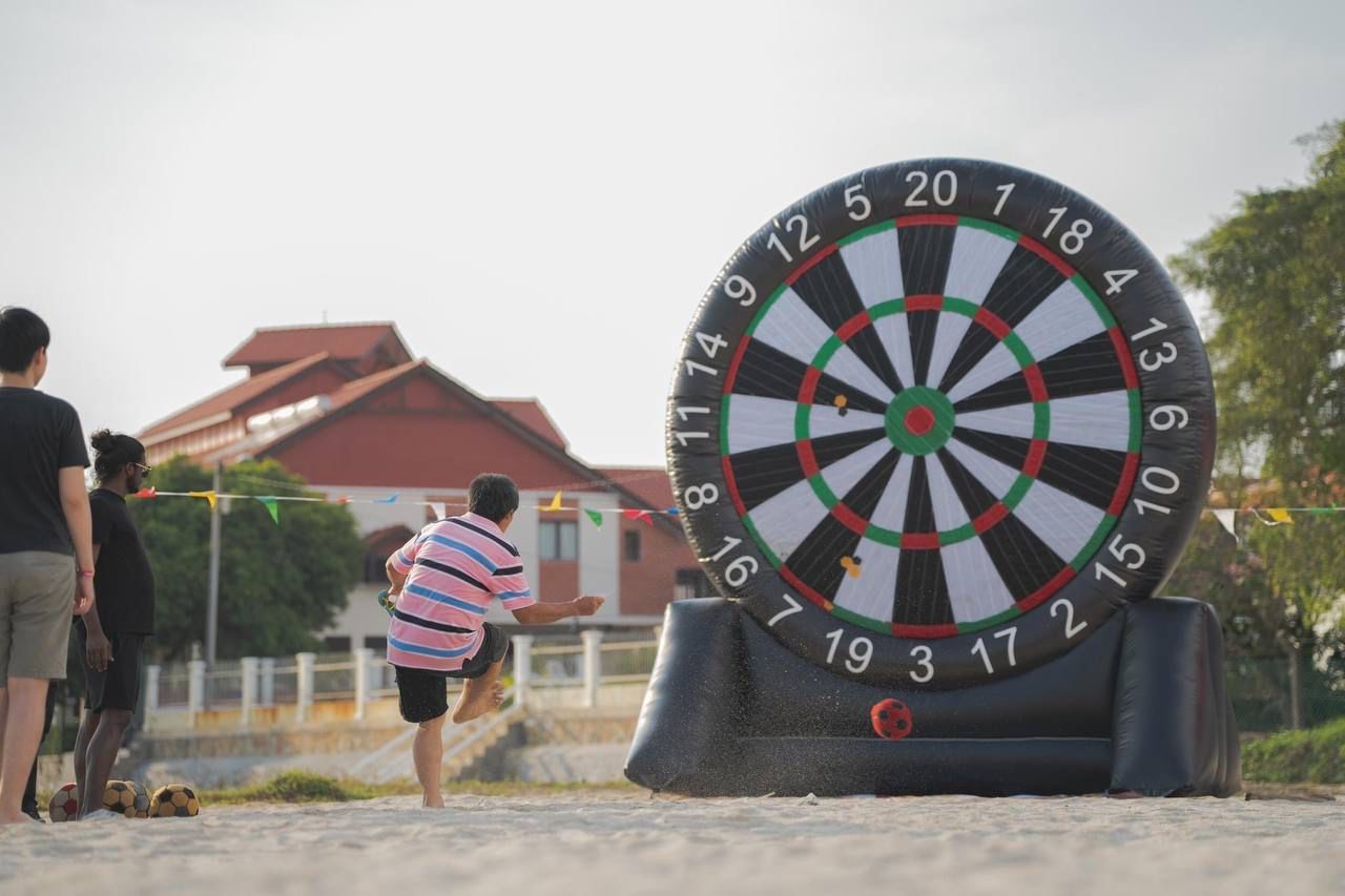 Kick it up a notch with our Soccer Dart Inflatable Challenge! Participants aim for precision as they kick soccer balls at a giant inflatable dartboard. Ideal for soccer enthusiasts and those up for a kicking and scoring challenge, this interactive game adds a sporty touch to any event. Book now for an exhilarating experience that fosters skill and creates memorable moments of Soccer Dart Inflatable fun!