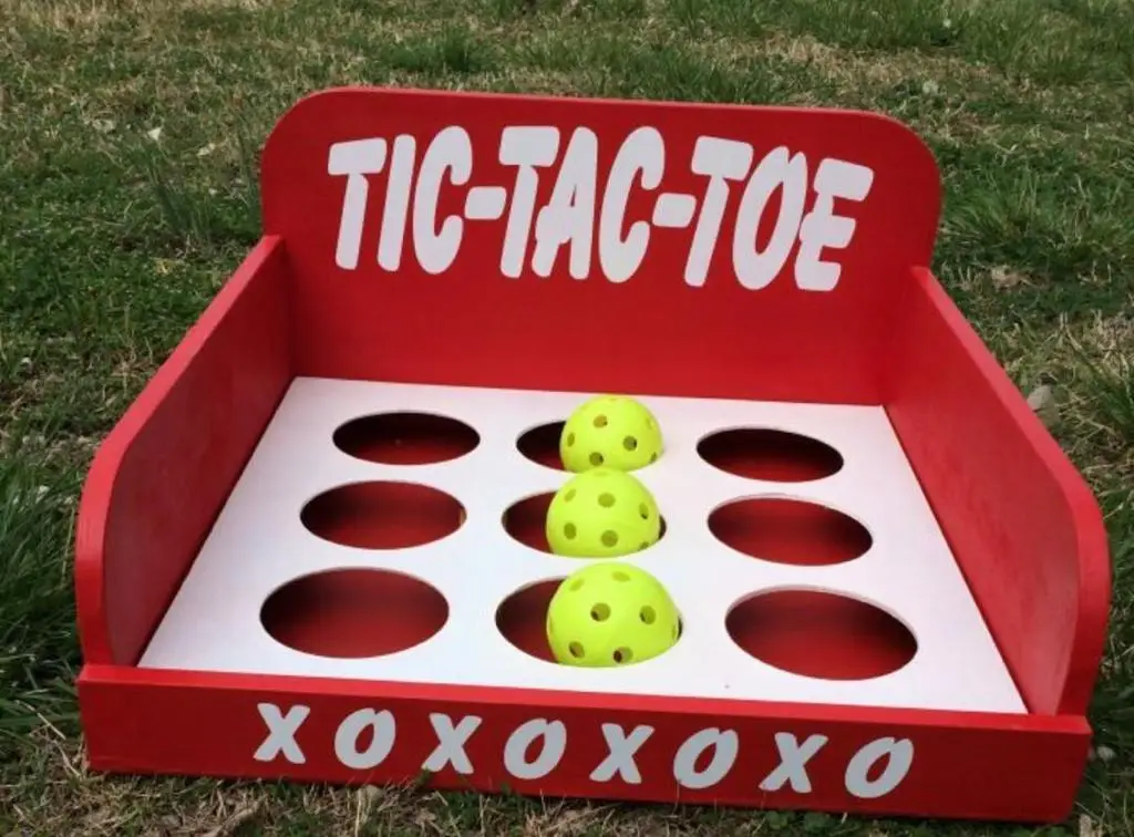Participants aim to strategically toss balls onto the grid, seeking three in a row.